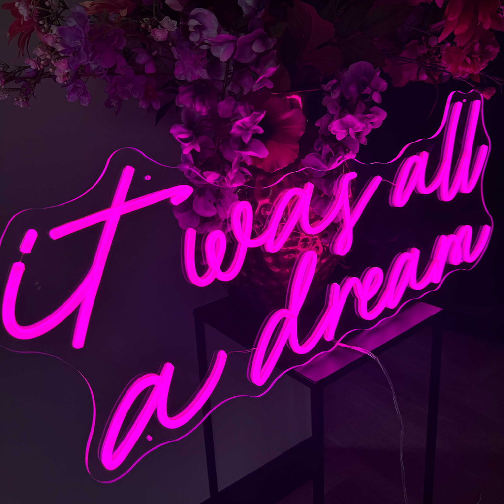 Com a gente, você encontrará iluminação de néon da mais alta qualidade para atender todas as suas necessidades. Nosso Sinal de néon "It was all a dream" é fabricado com atenção aos detalhes e à habilidade artesanal. Com a mais recente tecnologia de néon LED, oferecemos uma solução durável e energeticamente eficiente para uma atmosfera mágica e vibrante. Desfrute do brilho hipnótico da luz de néon sem se preocupar com tubos frágeis e altos custos de energia.